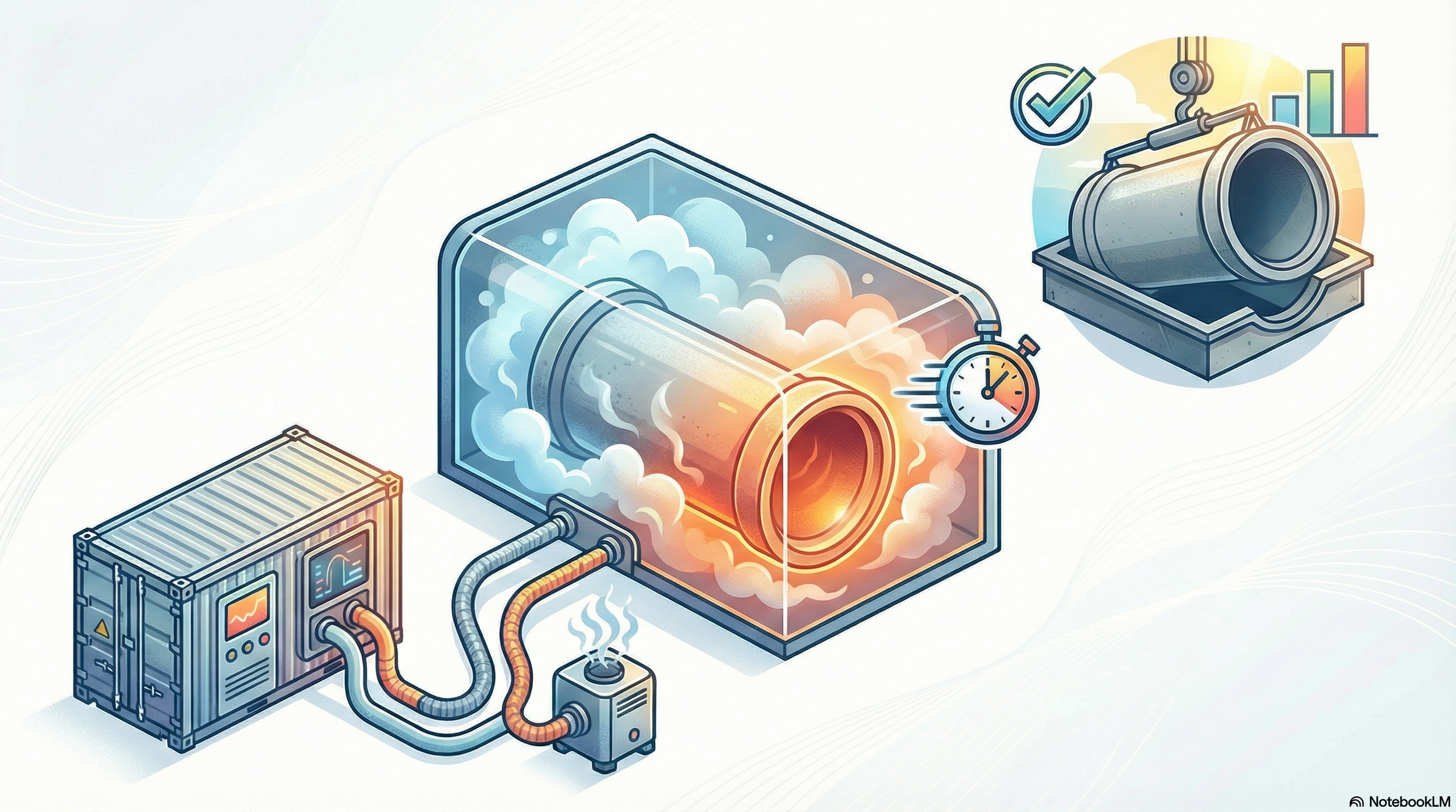 Direct-fired steam generators cure precast concrete pipe by delivering instant, low-pressure hot vapor to accelerate cement hydration in a controlled, humid environment.